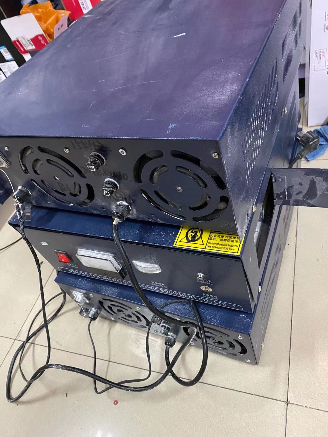 2.观察电流表的电流大小,如果电流比额定电流过小,首先应检查超声波震板是否有损坏,例如震子脱落,震子晶片破裂,粘结胶水开裂等,连接导线是否有短路等。一般情况下,如果电流下降不多或基本没有下降,而声音又正常,但是超声强度下降比较厉害,则很可能是震子粘结胶水开裂,其判断方法为;观察震子与钢板连接处的胶水涂层,正常情况下应该是光滑的表面,如有细小裂痕则很可能是胶水已开裂,此时应该把震子取下重新粘结,如电流下降比较厉害,则主要检查是否有连接导线断路或震子晶片片裂。